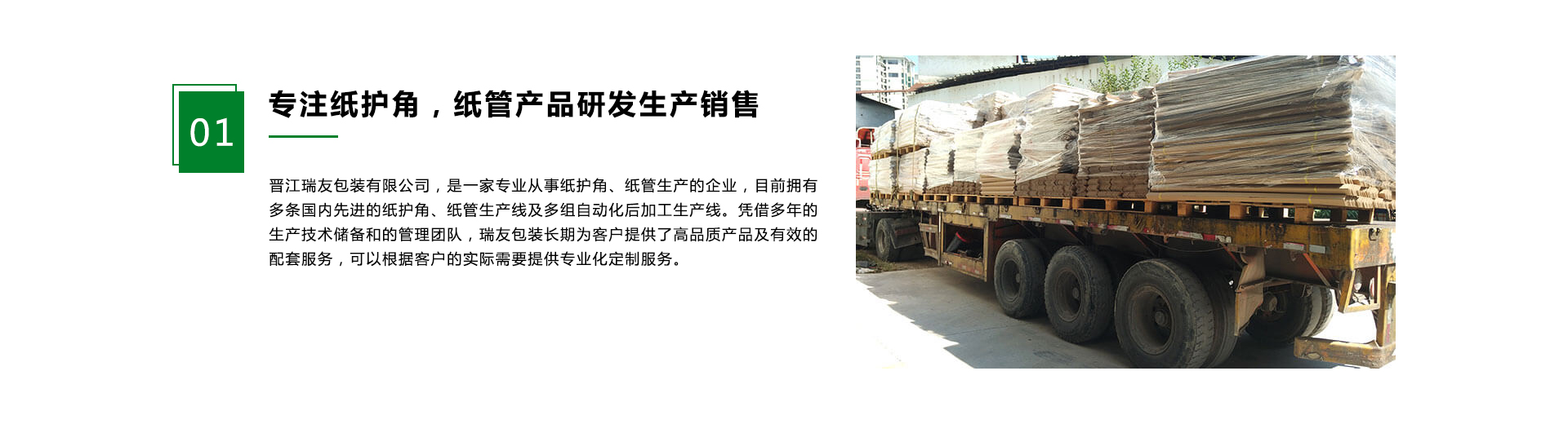 晉江瑞友包裝有限公司,是一家專(zhuān)業(yè)從事紙護(hù)角、紙管生產(chǎn)的企業(yè),目前擁有多條國(guó)內(nèi)先進(jìn)的紙角、紙管生產(chǎn)線(xiàn)及多組自動(dòng)化后加工生產(chǎn)線(xiàn)。憑借多年的生產(chǎn)技術(shù)儲(chǔ)備和的管理團(tuán)隊(duì),瑞友包裝長(zhǎng)為客戶(hù)提供了高品質(zhì)產(chǎn)品及有效的配套服務(wù),可以根據(jù)客戶(hù)的實(shí)際需要提供專(zhuān)業(yè)化定制服務(wù)。公司位福建省晉江市靈源街道小浯塘工業(yè)區(qū),設(shè)有全新的智能化工業(yè)紙板復(fù)合生產(chǎn)線(xiàn)。主要產(chǎn)品有:紙護(hù)角、紙管定做。 晉江瑞友包裝有限公司熱忱歡迎新老用戶(hù)與我們攜手并進(jìn),共創(chuàng)輝煌。